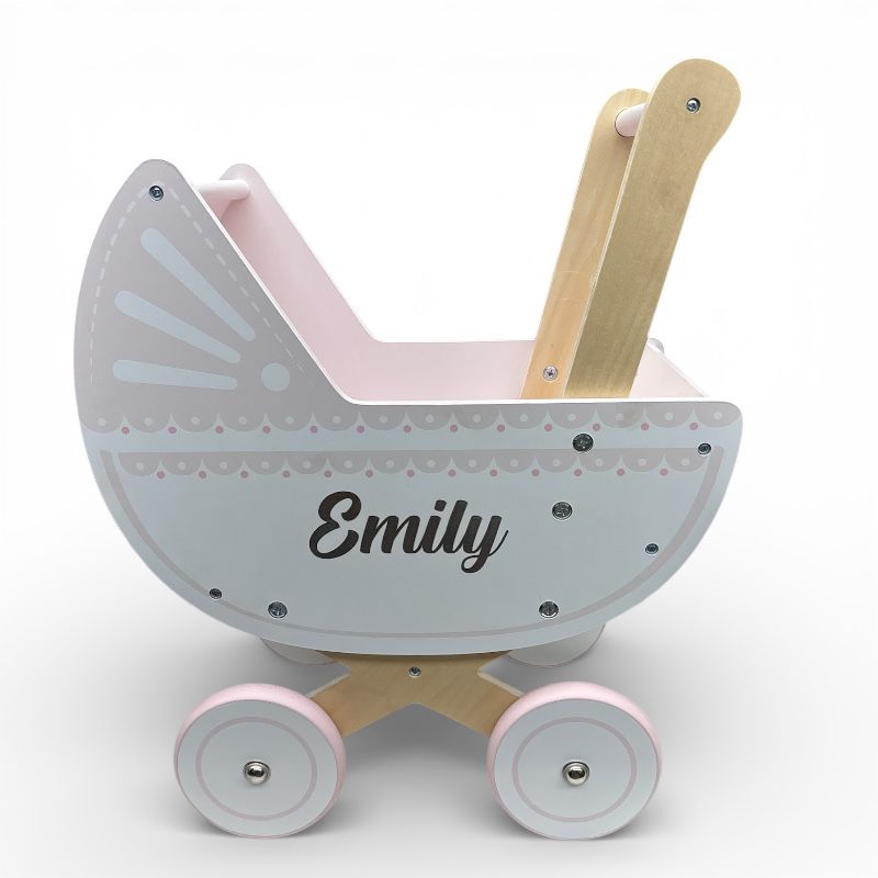 Laat kleine harten sneller kloppen met deze stijlvolle houten poppenwagen met naam. Met haar zachte kleuren, hoogwaardige afwerking en persoonlijke gravure is dit het perfecte speelgoed voor iedere kleine poppenmama of poppenpapa.