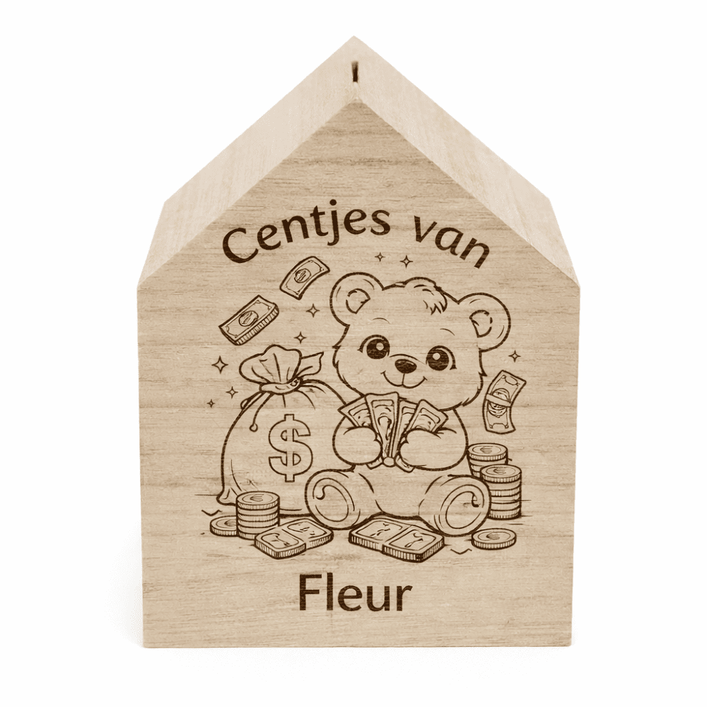 Met een zorgvuldige lasergravure wordt deze spaarpot kind volledig gepersonaliseerd. Of het nu gaat om een naam, datum of speciale tekst – jij bepaalt zelf het ontwerp.