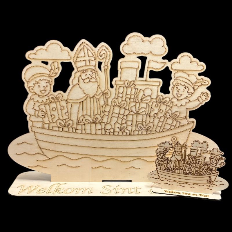 Laat kinderen hun creativiteit de vrije loop met dit prachtige Sinterklaas knutselen schildersetje. Het gedetailleerde houten tafereel toont Sinterklaas en zijn Pieten op de stoomboot vol cadeautjes, met de tekst “Welkom Sint en Piet!”.